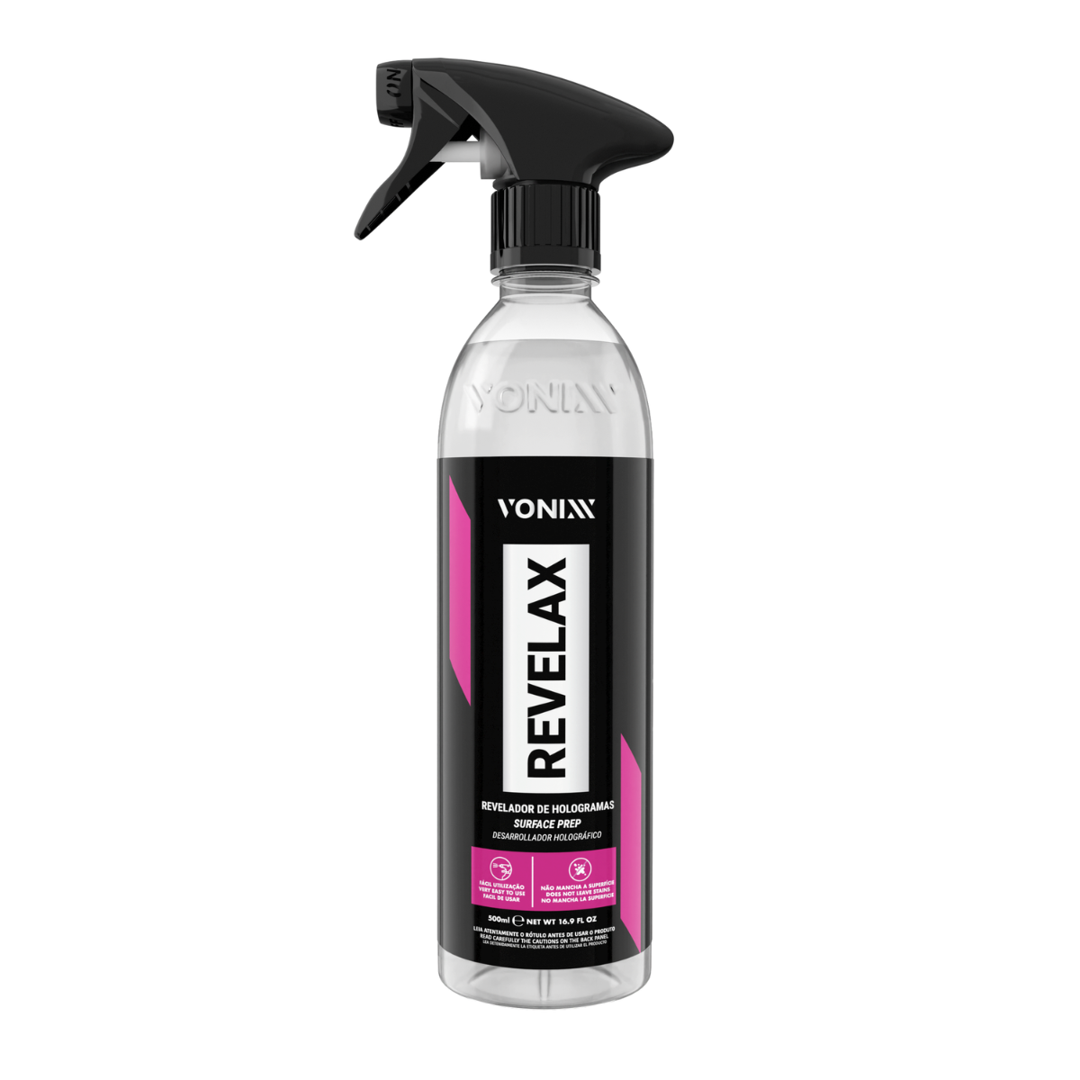 Revelax evidencia defeitos da pintura, como hologramas e swirls mascarados por ceras, selantes e polidores. É também recomendado para limpeza de vidros e descontaminação de plásticos, principalmente antes da aplicação de V-Plastic, removendo produtos como silicones e contaminações diversas. Seu uso deixa a peça pronta para inspeção antes de qualquer trabalho.